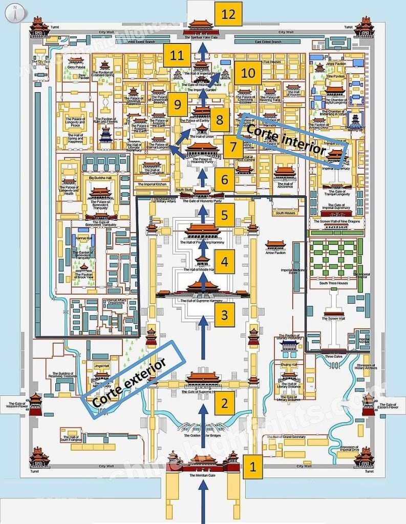 Haces toda esta fila y pasado el control de seguridad de la puerta 午门 Wu Men, habrás llegado al primer patio interior, donde verás nuevamente los 5 puentes con el mismo concepto y más adelante la Puerta de la Armonía Suprema 太和门 Tai He Men (2) donde verás también la imagen de dos leones con apariencia de dragón en ambos costados de la puerta.