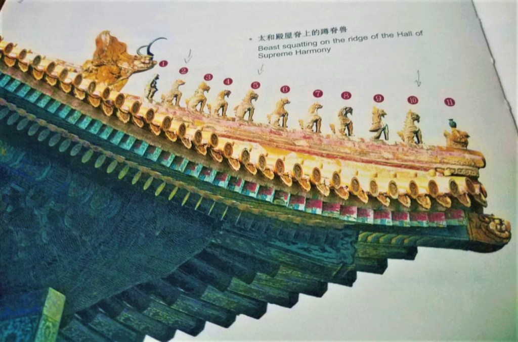 En las esquinas de los techos de todas las puertas o palacios se pueden distinguir unas pequeñas gárgolas o dragones en diferentes representaciones, que servían para proteger a los palacios de los malos espíritus o para catalogarlos en base a su importancia, el palacio más importante y qué más cantidad de gárgolas o dragones posee, es justamente el Palacio de la Armonía Suprema. Veamos cuáles son estas criaturas con apariencia de dragones, qué significan y cómo se llaman.
