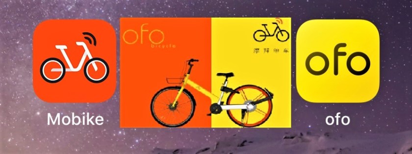 La primera, OFO, es una empresa de bicicletas compartidas fundada en Beijing en 2014. Actualmente, opera más de 10 millones de bicicletas en 250 ciudades y 20 países. El sistema «dockless»(no almacenamiento) usa su aplicación en teléfonos inteligentes para desbloquear y ubicar bicicletas cercanas, cargando una tarifa por hora y distancia en el uso de la misma.