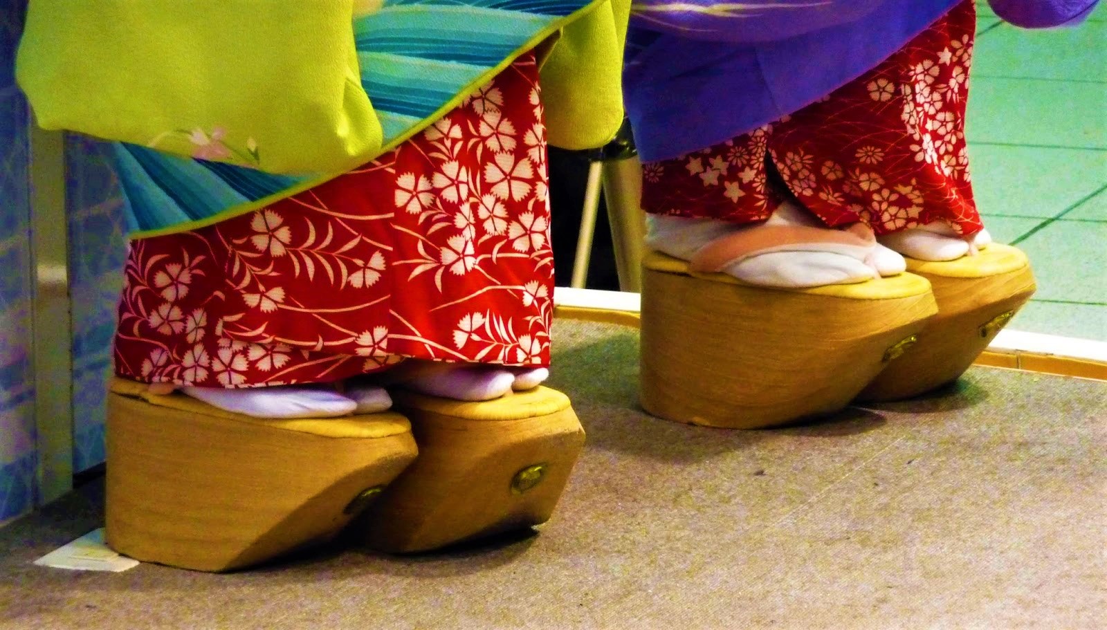 La geisha utiliza sandalias de suela baja de manera y laca, llamadas zori, y en interiores lleva sólo los tabi (calcetines divididos en los dedos). En zonas nevadas, las geishas utilizan zuecos de madera, llamados geta. Las maiko llevan altísimos zuecos negros, okobo. Los kimonos de las maiko son muy coloridos, con diversos diseños de flores y paisajes.