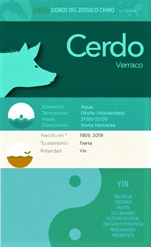 El carácter de cada animal suele asociarse a la actitud y forma de actuar de las personas a las que corresponde dicho año, pero no te sientas mal si te identificas con el año del cerdo, no te revolcarás en el lodo ni comerás sobras, aunque puede que debas tomar precauciones con temas de fertilidad. El cerdo es símbolo de riqueza, su cara gruesa y orejas grandes representan signos de gran fortuna, atrae el éxito en todos los aspectos de la vida, es el momento perfecto para realizar una revisión profunda de todo lo ocurrido en los últimos años y acumular la energía que se necesita para comenzar el nuevo ciclo (25 de enero 2020), que sería el año de la Rata de Metal.