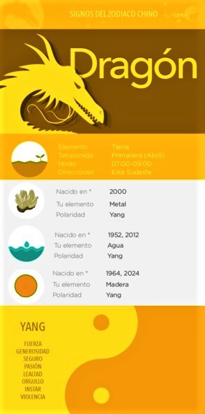 El Dragón, del latín draco y este del griego δράκων, drakon, «víbora» o «serpiente», en chino «Long» 龙, es nuestro tercer signo en la lista de animales pares y el quinto en el orden de animales del zodiaco chino. El primer año del Dragón en el Siglo XXI fue justamente el año 2000, año del «Dragón de Metal», y en cuanto a estadísticas socio-demográficas, se conoció como uno de los años «Baby Boom», al aumentar considerablemente el % de natalidad infantil. Cientos de miles de parejas se planificaron para que su retoño naciera en este año de buen augurio. Lo mismo pasó en su segunda aparición, en 2012, donde disfrutamos de un escurridizo «Dragón de Agua», asociado al Planeta Mercurio, de polaridad «Yang».