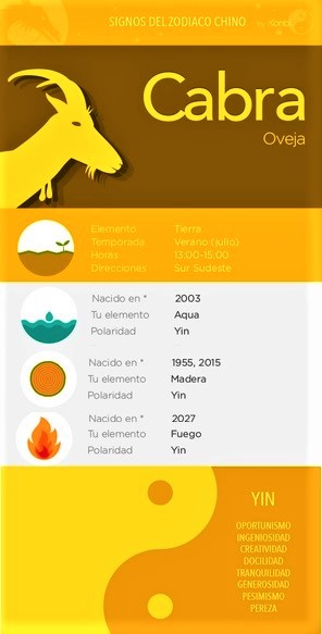 La Cabra, en chino «Yang» 羊, es el octavo animal en el horóscopo según el calendario «Yin Yang» y el cuarto en nuestra lista de animales impares. Como ya sabemos, cuando se divide el ciclo del zodiaco 黄道带 de los 12 animales (o signos) en dos series, o sea pares e impares, cada animal puede ocurrir solamente en “Yin” o “Yang”, por tanto, el dragón siempre es “Yang” y la serpiente siempre es “Yin”, y así con todos.