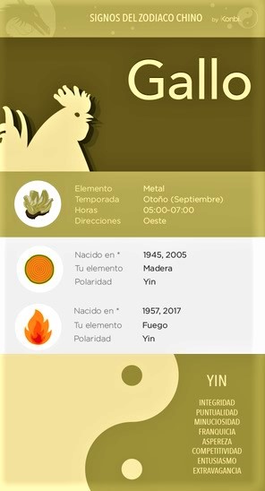 El Gallo, en chino “Ji” 鸡, es, además de «el rey del patio», el décimo animal en el zodiaco y el quinto en el grupo de animales impares. Como ya sabemos, cuando se divide el ciclo del zodiaco 黄道带 de los 12 animales (o signos) en dos series, o sea pares e impares, cada animal puede ocurrir solamente en “Yin” o “Yang”, por tanto, el dragón siempre es “Yang” y la serpiente siempre es “Yin”, y así con todos.