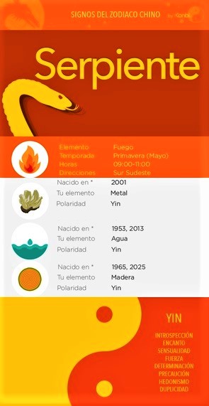El primer año del la serpiente en el Siglo XXI fue el 2001, donde tuvimos una dura «Serpiente de Metal», asociado al Planeta Venus, de polaridad «Yin». Nuevamente, en 2013, vivimos una «Serpiente de Agua/Aire», perteneciente al Planeta Mercurio. Su próxima presentación será en 2025, del 29 de Enero de 2025 al 16 de Febrero de 2026, pero esta vez será una «Serpiente de Madera», perteneciente al Planeta Júpiter, y también de polaridad «Yin».