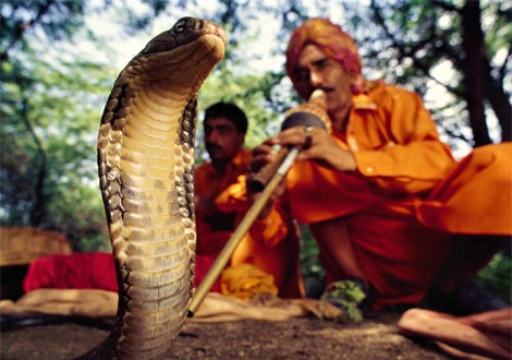En la India, país de innumerables doctrinas religiosas y filosóficas, se práctica la adoración a diferentes animales, entre ellos, a la serpiente. Durante el festival «Nag Panchami», los reptiles son «encantados» con la música de una flauta frente a la devoción de miles de fieles y la mirada de muchos curiosos, la típica imagen del hombre con turbante que toca una flauta para hacer salir a la serpiente de la cesta.
