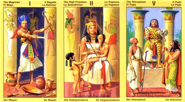 Los sacerdotes guardaban los secretos de los cielos, y dentro de una compleja jerarquía de dioses y deidades, cada dios tenía un poder específico y gobernaba sobre determinada área de influencia. Por ejemplo, Osiris era el dios de los muertos. Isis era la esposa y hermana de Osiris, protectora de los muertos. Thoth era el dios del aprendizaje, inventor de los jeroglíficos y escriba de los dioses. Muchos símbolos y deidades egipcias reaparecen en el estudio oculto de las cartas del Tarot de nuestros días.