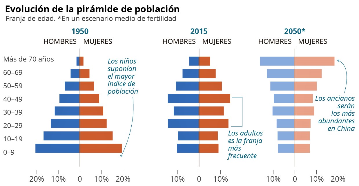 La población china envejece, eso ya es un hecho, pero al Partido Comunista Chino (PCCh) se le ha dado vuelta la tortilla y el daño colateral hoy les ruboriza el rostro. China es el primer país envejecido aún en vías de desarrollo. Hoy cuenta con un 15% de la población por encima de los 65 años y será del 25 % para el 2040, el doble que en la India.