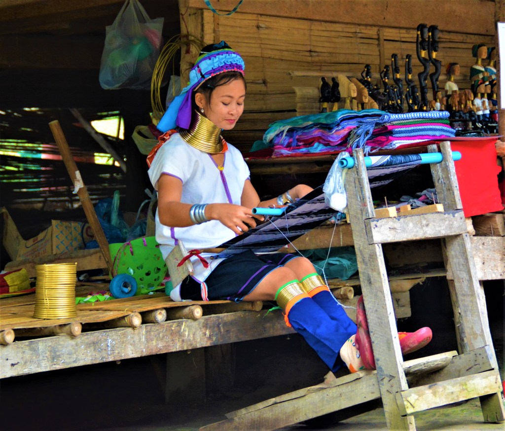 Dicha etnia proviene originalmente de Birmania, considerada una de las minorías étnicas tibeto-birmanas que emigró a Tailandia debido al conflicto con el régimen militar de ese país en 1975. Actualmente, sufren el drama de no ser reconocidos jurídicamente ni por Birmania ni por el Reino de Siam (Tailandia), por tanto, no tienen derechos, no pueden trabajar, carecen de documentos de identidad oficial, con estatus de «refugiados» e invisibles al gobierno. Es por ello, que una de sus fuentes de sustento, al menos la más fácil, sea intercambiar privacidad por acceso turístico.
