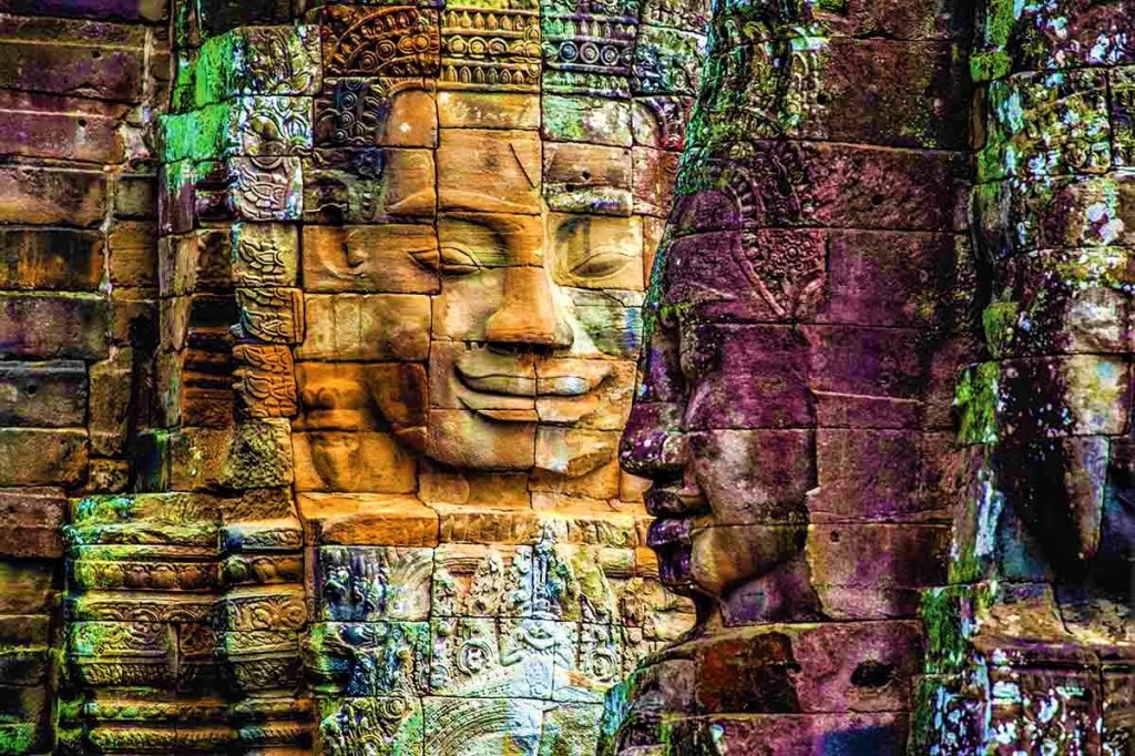 Construido bajo el reinado de Jayavarman VII, hacia fines del siglo XII, el Templo Bayón es el corazón de Angkor Thom, ocupa el centro del enclave y sus ricos bajorrelieves representan la vida cotidiana de los jemeres en su época de grandeza, los cuales no tienen nada que envidiar a los de Angkor Wat. En dichos relieves podemos apreciar cómo era el día a día de los habitantes de Angkor. Se considera un reflejo del palacio celeste del dios Indra. Los rostros de Avalokiteshvara mirando a los puntos cardinales transmiten una paz contagiosa, siendo imposible permanecer inmune al embrujo, el misterio y la calidez que desprenden, por lo que también se le conoce como el templo de las sonrisas, llegando a tener hasta 200 rostros felices (sumando el tuyo serían 201).