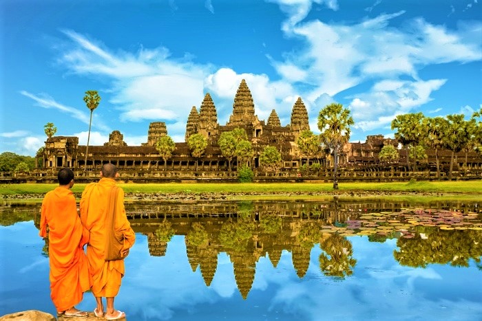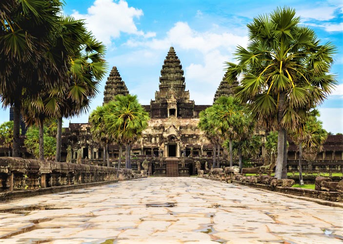 Angkor (ciudad) Wat (templo), declarado Patrimonio de la Humanidad en 1992, con unos 200 kilómetros cuadrados de extensión, figura incluso en la bandera de Camboya. Es similar en tamaño al área metropolitana de Nueva York, donde la vida parece fluir sobre las viejas celdas encarnadas en sus gigantescas raíces. Fue la antigua capital jemer devorada por la jungla, set de rodaje del mítico filme «Tomb Raider», la mayor edificación religiosa del mundo, constituye también un homenaje al dios Vishnú, quien facilitó la victoria de los dioses al proporcionarles el elixir de la inmortalidad, en el mítico combate entre dioses (deva) y demonios (asura).