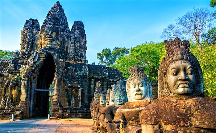 Considerado por muchos más bello que el propio Templo de Angkor Wat, Angkor Thom fue, desde finales del siglo XII, la capital del imperio Jemer, fundado por el famoso Rey Jayavarman VII. Después de su coronación en 1182 D.C., el rey fortificó su morada con altos muros laterales de doce kilómetros de largo, atravesados por cinco imponentes puertas, conocidas como «Las Puertas de Angkor Thom».