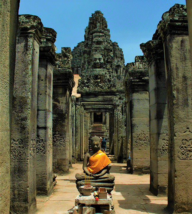 ¿Por qué su construcción en honor a un dios hindú? Durante siglos, Angkor fue un espacio reservado únicamente al culto, pero en 1186, Jayavarman VII construyó este monasterio con celdas para centenares de monjes. En todo ese tiempo, se construyeron los actuales templos de Angkor y el hinduismo primitivo se enriqueció con otra creencia también procedente de India, el budismo. En el siglo XII, el budismo se implantó como religión principal, tras el abandono final de la ciudad durante la época colonial francesa.