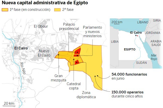 Este proyecto, con 200 kilómetros de carreteras que conectan la ciudad nueva con El Cairo y el resto del país, es una megaurbe construida de la nada en el desierto y a la que solo los más pudientes tendrán acceso. Con una superficie de 730 kilómetros cuadrados, más que Madrid y Barcelona juntas, 12 veces más grande que Manhattan y 3 veces mayor que Washington, algo más que la isla de Menorca o del tamaño de Singapur, albergará cerca de 6 millones de habitantes y dará empleo a casi 2 millones de personas.