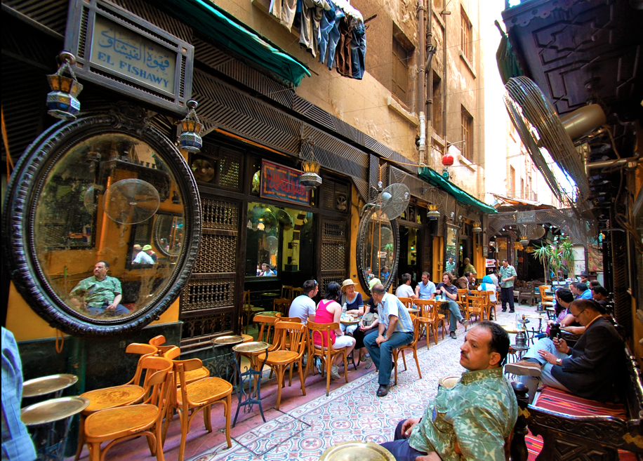 No obstante recuerda que estas en El Cairo, en esta ciudad es difícil encontrar un lugar donde estar tranquilo. La persistencia de los vendedores ambulantes que no paran de ofrecerte las mismas baratijas constantemente e insistiendo por un «baksheesh» (regalo, propina o limosna), lo cual perturba esa tranquila degustación de «karkaday» (infusión hecha con flores secas de hibisco o agua de jamaica), té (shai) y «narguile» (shisha) jugando a la «tawla» (backgammon) que venías buscando.