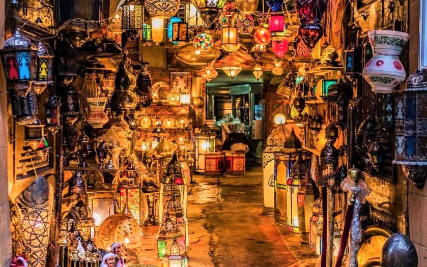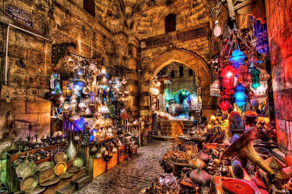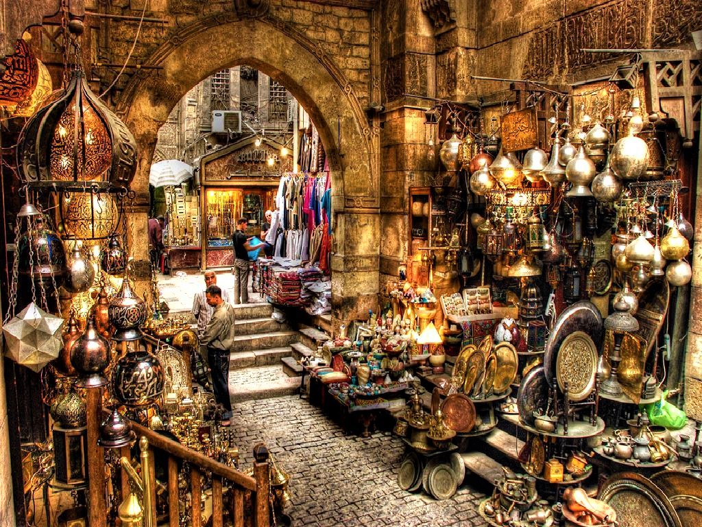 El gran zoco de Khan El Khalili o Jan el-Jalili خان الخليلي, un lugar multicolor con aroma de especias inolvidables, lámparas de metal talladas con motivos árabes, telas y escarabajos para el buen augurio, constituye el mercado – bazar más importante y famoso de Egipto y la principal área comercial de El Cairo, fundado en el siglo XIV alrededor de varias fondas en las que pernoctaban las caravanas.