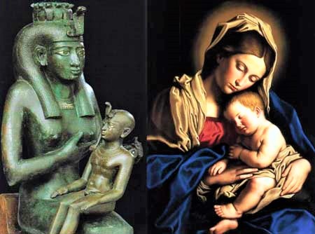El clasicista R. E. Witt veía a Isis como la «gran precursora» de María, y señaló que ambas tenían en común varias esferas de influencia, como la agricultura y la protección de los marineros y comparó el título de María como «Madre de Dios» con el mismo epíteto de Isis, al igual que el de ambas como «Reina de los Cielos». Stephen Benko, un historiador estudioso del cristianismo primitivo, argumenta que la devoción a María estaba profundamente influenciada por la adoración de varias diosas paganas, no solo de Isis. En contraste, John McGuckin, un estudioso de la Iglesia, dice que María adquirió rasgos superficiales de estas diosas en la iconografía, pero que los fundamentos de su culto eran completamente cristianos. El arqueólogo canadiense Vincent Tran Tam Tinh señala que las últimas imágenes de Isis amamantando a Horus datan del siglo IV D.C., mientras que las primeras imágenes de María amamantando a Jesús datan del siglo VII D.C.