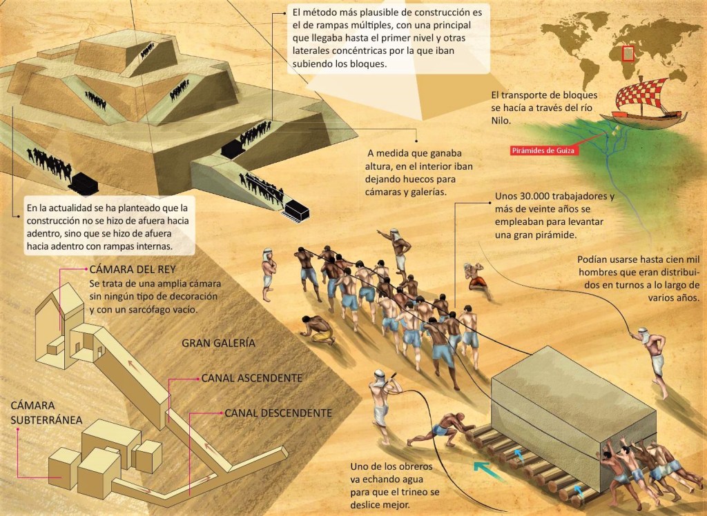 Según el antiguo historiador griego Herodoto, quien visitó Guiza en el año 450 a.c., la Gran Pirámide tardó 23 años en construirse y exigió el trabajo de 100.000 hombres. Esta cifra es creíble dado el supuesto que estos hombres, que eran trabajadores agrícolas, laboraban en las pirámides solo (o principalmente) mientras había poco trabajo por hacer en los campos, es decir, cuando el río Nilo estaba inundado. Los bloques salían de la cantera con una inscripción que mostraba su fecha de extracción, el equipo encargado de su transporte y la zona de la pirámide a la que éstos estaban destinados. Gracias a estas inscripciones encontradas en las pirámides se pudo saber ciertos datos sobre el proceso de construcción. Por ejemplo, las pirámides eran construidas durante todo el año, y no sólo en la época de la inundación. Esto se sabe porque se han hallado bloques con fechas pertenecientes a todas las estaciones del calendario egipcio en la pirámide de Meidum, terminada por Esnofru (padre de Keops).