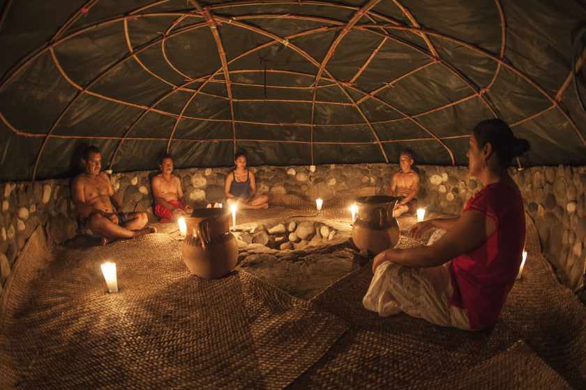 Un guía hombre o mujer, dirigirá la energía que le es propia al ser humano y las actividades dentro del recinto, dará la bienvenida y presentará a los participantes; acompañándose del sonido y vibración del agua chocando con las rocas, de diversos instrumentos musicales prehispánicos – sonidos análogos al corazón que despertarán la memoria de órganos y tejidos del organismo.