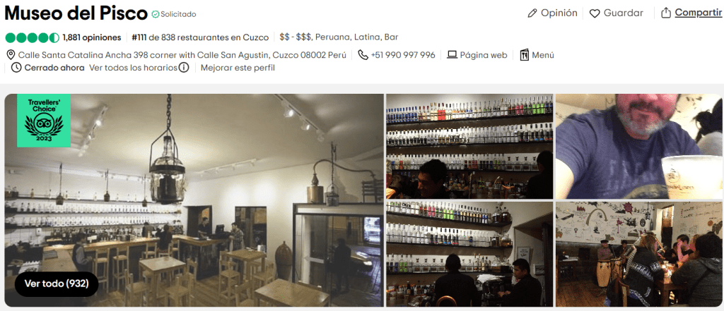 3- Museo del Pisco, un local icónico con más de 13 años de tendencia y éxito en el mundo de la coctelería, un referente de cultura y calidad. Además de pisco podrás disfrutar de unas exquisitas tapas, bar de sushi y ceviches.